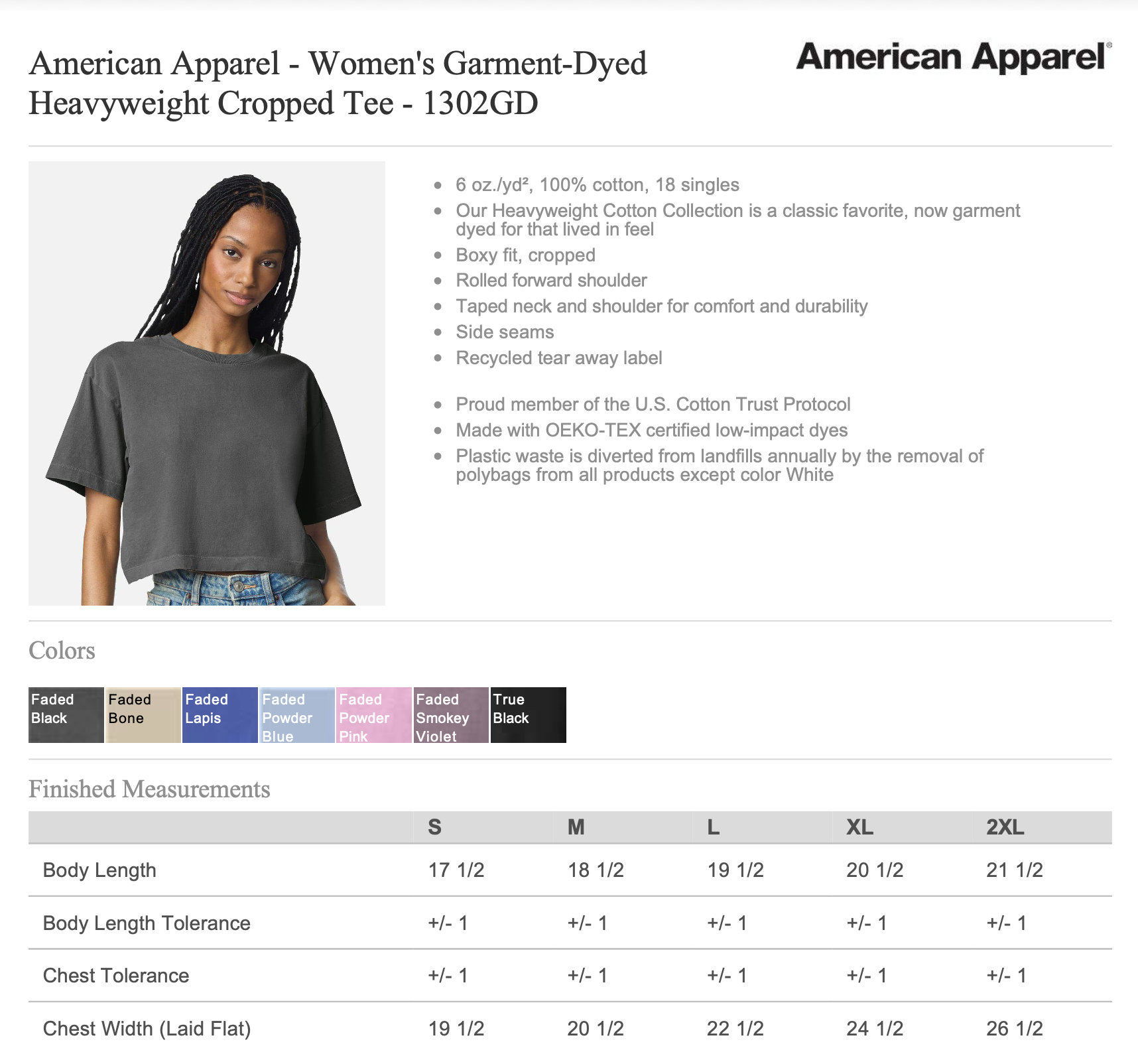 1302GD – American Apparel Women’s Garment-Dyed Heavyweight Cropped Tee